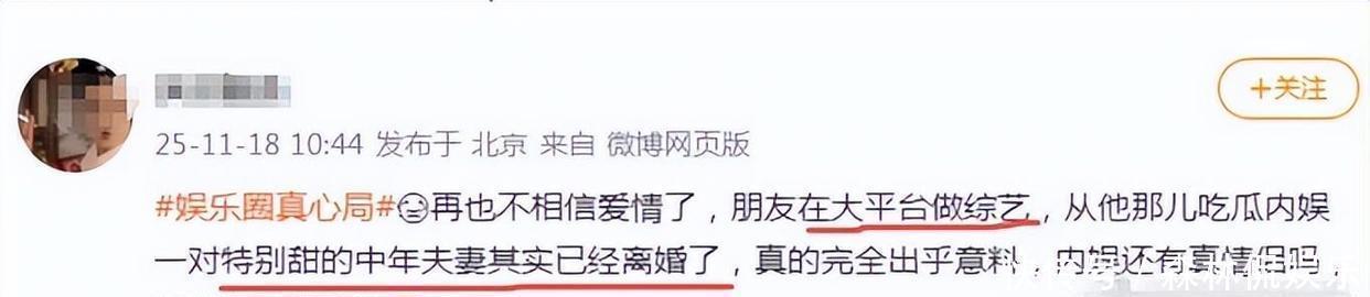 知情人爆料11月18日,有人在网上爆料说一对中年夫妻感情甜蜜,但实际上已经离婚了,这事一出来,网友们都开始八卦起来。有段话没有点名具体人名,网友们猜测不断。有些认为是孙俪和邓超的,有人猜是吴奇隆和刘诗诗的,还有一些觉得是戚薇和李承铉的,至于唐嫣和罗晋的呼声也挺高的。