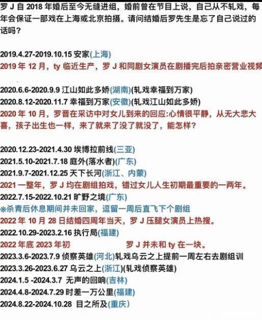 到2024年这一整年,他一直在吉林、福建和重庆奔波拍戏,几乎都没回过家。罗晋的行程排得满满当当,一会儿刚结束一段工作,紧接着又投入到新的剧组,拍戏的日子明显比待在家里的时间长不少。除了2019年他在上海拍剧,那之后的五六年,他几乎是在全国各地跑来跑去拍戏。